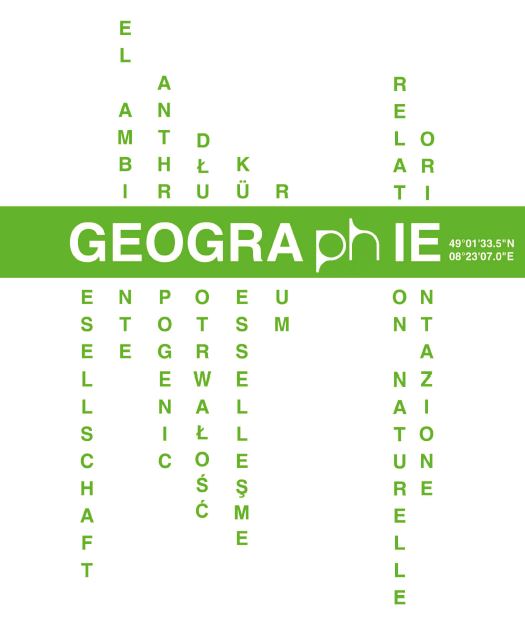 Es wird ein Tablet mit dem Logo des Faches gezeigt. Das Logo zeigt die Bedeutung von Geographie an der Pädagogischen Hochschule Karlsruhe, wie Raum mehrsprachig zwischen Gesellschaft und Umwelt verhandeln.