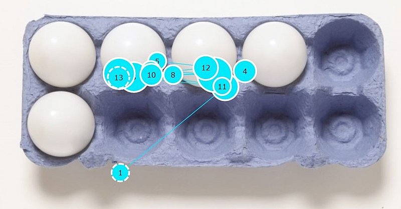 Um Mengenwahrnehmung und Anzahlbestimmung im Vorschulalter auf die Spur zu kommen, setzte Dr. Priska Sprenger auf eine Kombination von Beobachtung, Befragung und Eye Tracking. Sie zeigte Kindern am Bildschirm Fotos von Eierkartons mit fünf bis neun Eiern und forderte die Jungen und Mädchen auf zu sagen, wie viele Eier sich jeweils in einem Zehnerkarton befinden. Außerdem sollten die Kinder erklären, wie sie zu ihrem Ergebnis gekommen waren. Durch einfaches Abzählen? Oder durch Strukturierungen wie „Eine volle Reihe und eins“ oder „Drei Eier und drei Eier und noch eins“? Ob und wie die Kinder Strukturen wahrnehmen, entzieht sich jedoch oft der Beobachtung. Außerdem können Fünf- bis Sechsjährige oft noch nicht erklären, was genau sie gemacht haben. Deshalb hat Dr. Sprenger die Blickbewegungen der Kinder zusätzlich mit einer speziellen Eye Tracking-Kamera aufgezeichnet. Die auf diese Weise gewonnenen Bilder zeigen anhand nummerierter Blickpunkte, in welcher Reihenfolge die Kinder wo hingeschaut haben.